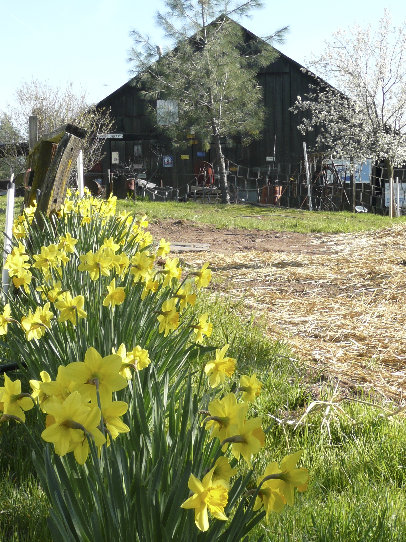 In Springtime, there is green grass everywhere, flowers sprouting up, including yellow and white dafodills, blue iris and numerous fruit trees in blossom.